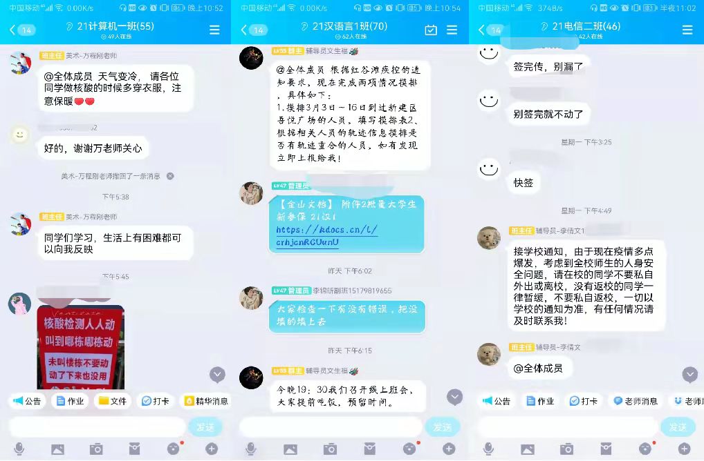 各位辅导员严格执行疫情防控相关文件要求,坚持每天通过班级群,关心问候学生,及时传达防控政策与方法,传达学校的关心与关爱,摸排学生身心状况,回应学生关切,做好数据整理与上报。