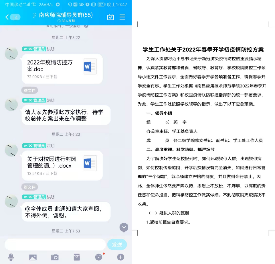 3月15日上午,学生工作处在我校辅导员群分别发布了《2022年疫情防控方案》《关于对校园进行封闭管理的通知》,在学生工作队伍中迅速拉响了疫情防控的警报。广大学生工作者积极行动起来,统一思想,提高站位,用实际行动做政治上的“明白人”、抗“疫”工作的“责任人”、青年学生的“贴心人”。