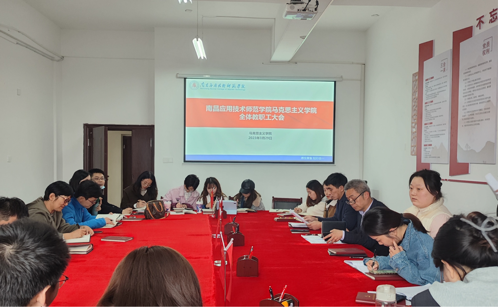 2023年3月29日14:00,马克思主义学院在1507会议室召开了全体教职工例会。院长文道贵、党总支副书记桂光泽,各教研室主任、各科室负责人以及学院全体教职工参加此次会议,会议由副院长卢林保主持。
