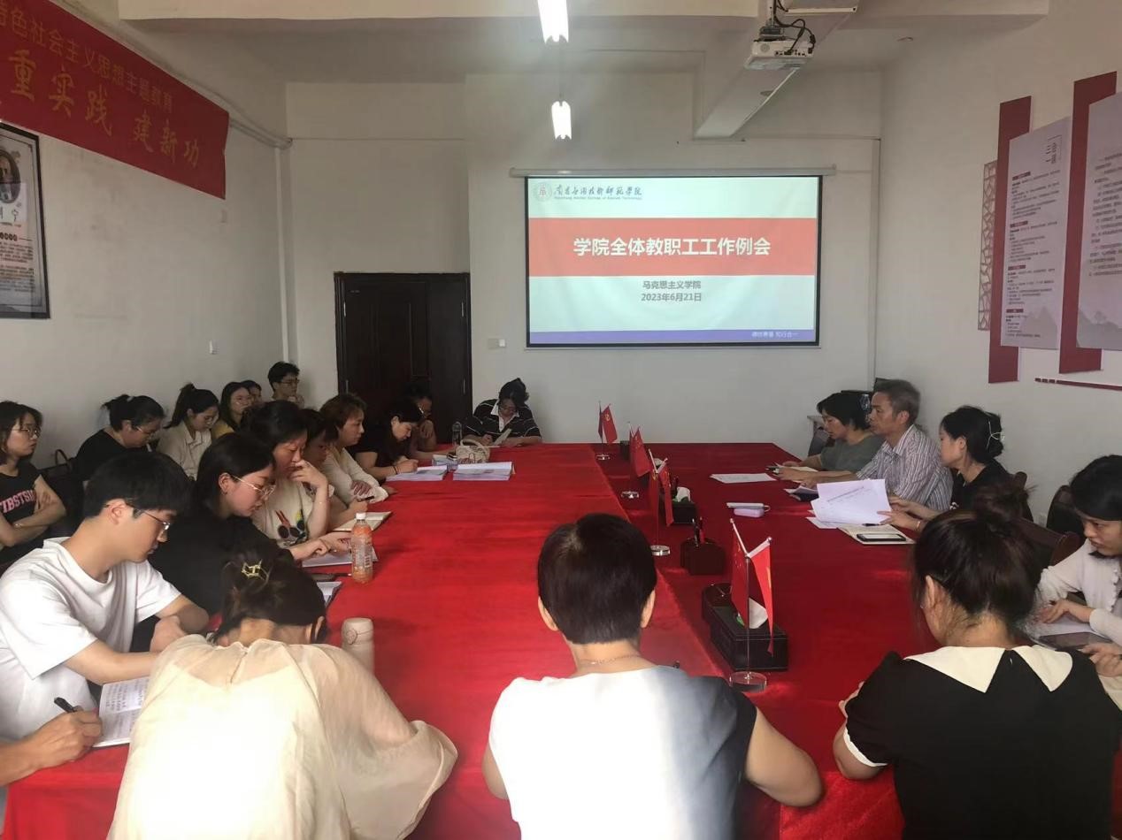 6月21日下午,马克思主义学院在1511会议室召开了第十四次全体教职工例会。院长、书记文道贵,党总支副书记李婷,副院长张丹,各教研室主任,各科室负责人以及学院全体教职工参加,会议由院长、书记文道贵主持。