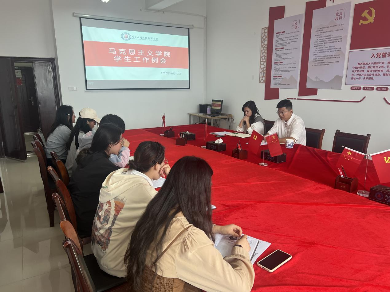 2023年10月12日,为扎实做好学生管理工作,提高学生工作效率,马克思主义学院召开“学生工作例会”,本次会议有马克思主义学院书记张欣康主持,党总支副书记李婷及全体专兼职辅导员参会。