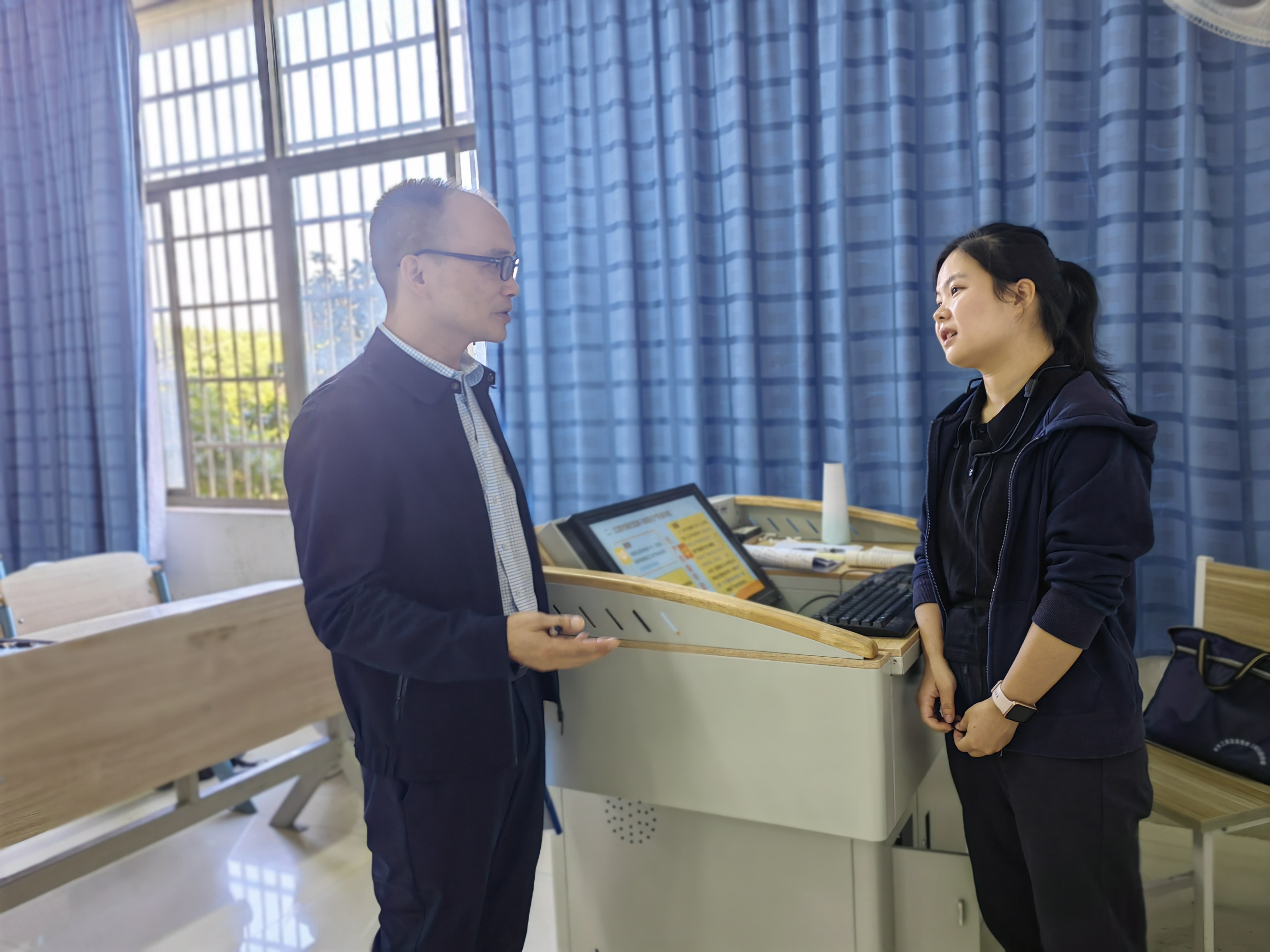 课后,蓝贤发与授课教师进行深入交流,对教师专业素养和课堂教学效果表示肯定,强调要进一步加强课堂教学组织形式设计,不断创新教学方式方法,不断提高思政课的思想性、理论性、亲和力和感染力。