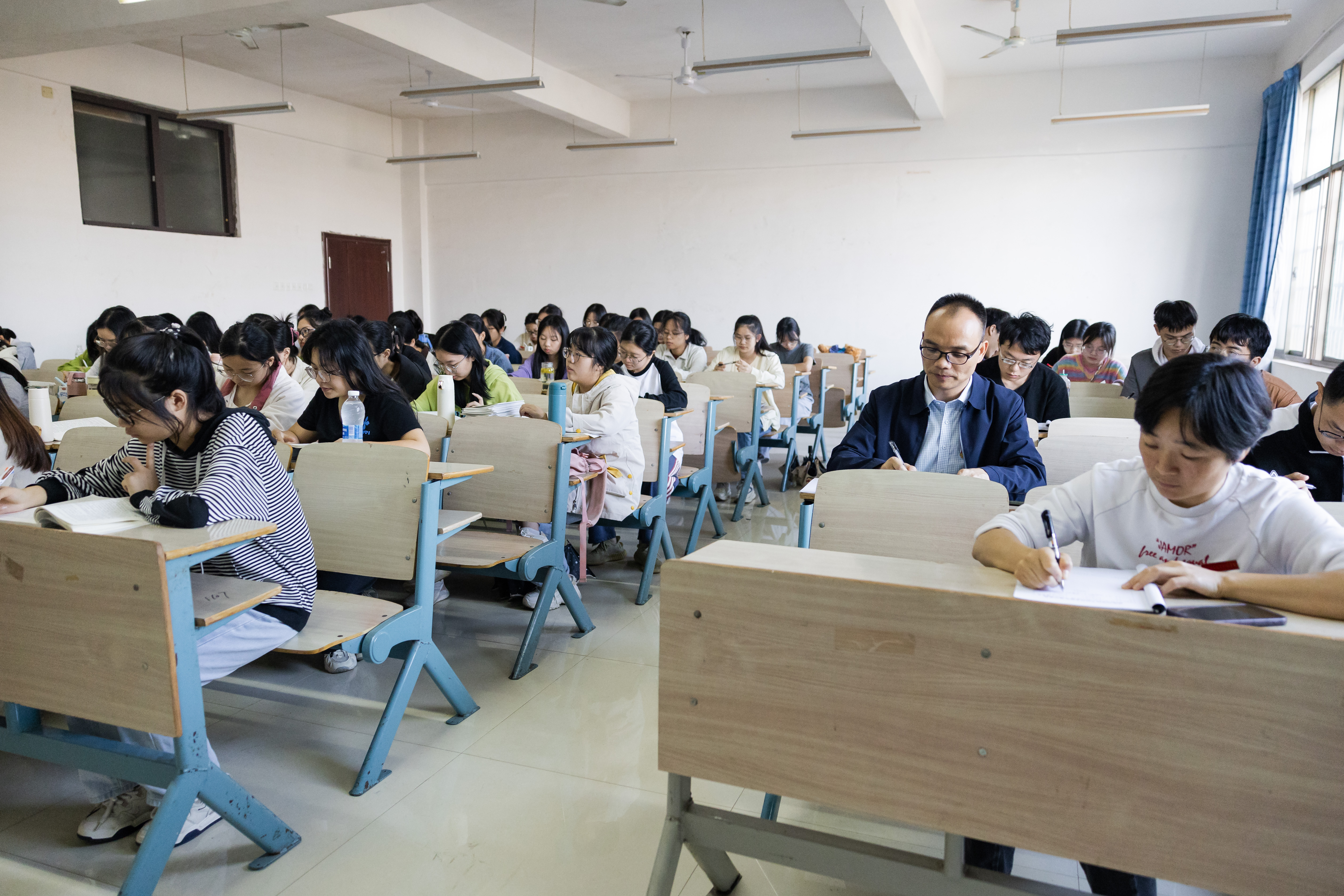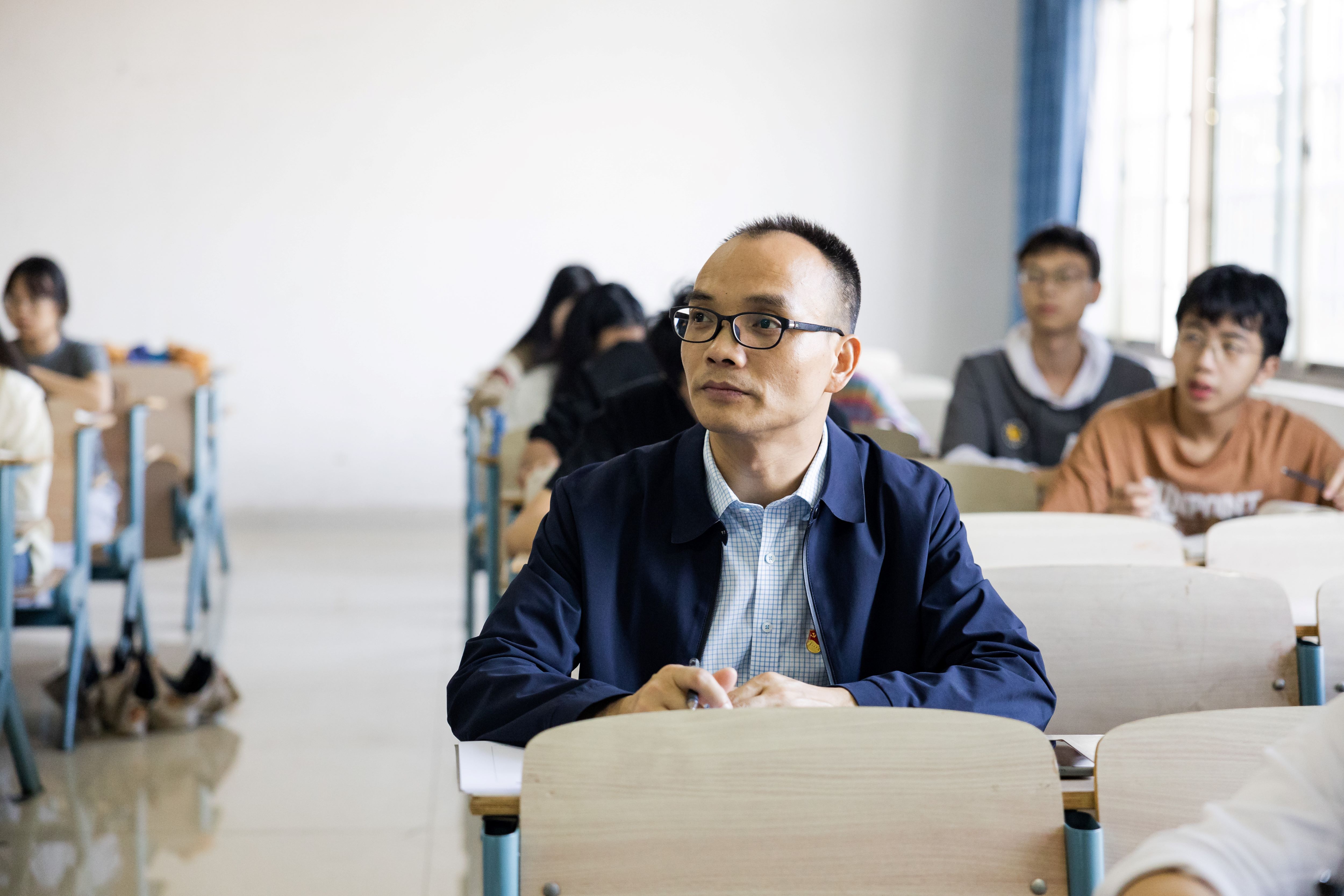 课上,蓝贤发认真听课做笔记,深入了解课堂教学环节设计、教学方法、教学效果和课堂纪律等。
