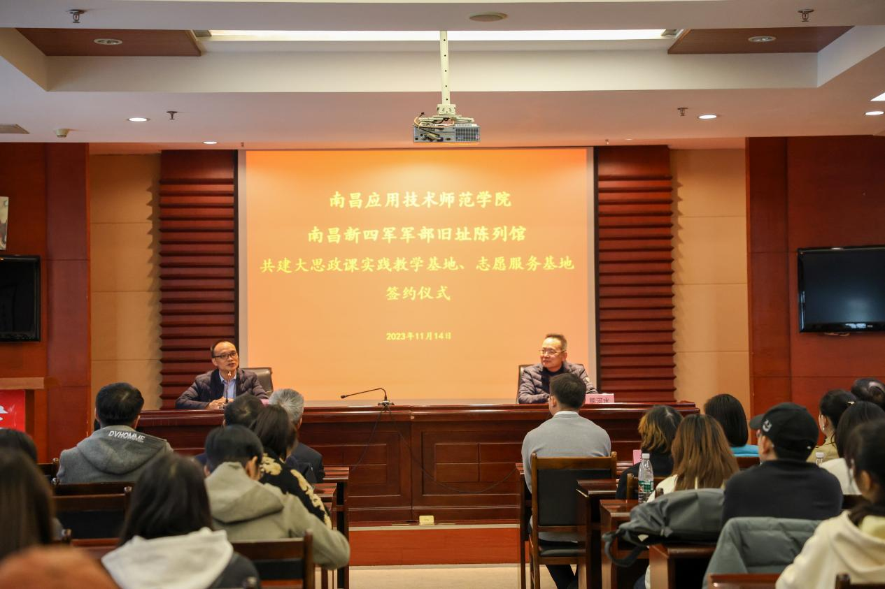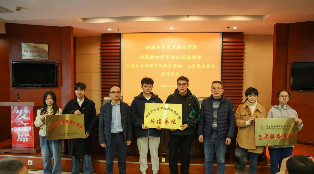 11月14日,南昌应用技术师范学院与南昌新四军军部旧址陈列馆合作共建“大思政课”实践教学基地、大学生志愿服务基地签约暨揭牌仪式在南昌新四军军部旧址陈列馆举行。校党委副书记蓝贤发、南昌新四军军部旧址陈列馆副馆长熊河水出席揭牌仪式,学校团委负责人,马克思主义学院负责人,思政课教师,学生代表80余人参加揭牌仪式。