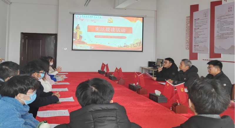 为进一步提高全体师生法律意识,引导学生深入了解宪法、尊崇宪法精神,增强法治观念,推动校园法治文化建设,马克思主义学院于2023年12月4日上午9:30在1511会议室组织开展了“宪法晨读”活动,活动由法学教研室主任李水根主持,院长文道贵、党总支书记张欣康、党总支副书记李婷、副院长张丹、法学教研室部分专任老师以及法学班20名学生参加。