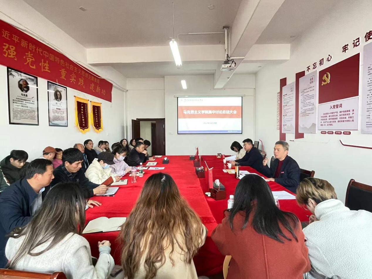 1月14日下午,马克思主义学院2023-2024学年寒假集中备课、研讨会总结大会在1511会议室召开。院长文道贵,党总支书记张欣康,党总支副书记李婷及学院全体教职工参加会议,会议由院长文道贵主持。