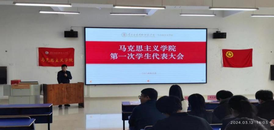 为深入学习贯彻落实学校第一次党员大会精神,总结交流过去beat365学生工作经验,研究确定今后一年beat365学生会工作目标,推动学院高质量发展,3月12日下午,马克思主义学院第一次学生代表大会在教学楼2311教室召开,马克思主义学院党总支书记张欣康、副书记李婷出席会议,学生代表参加会议,学院团委老师胡琛主持会议。