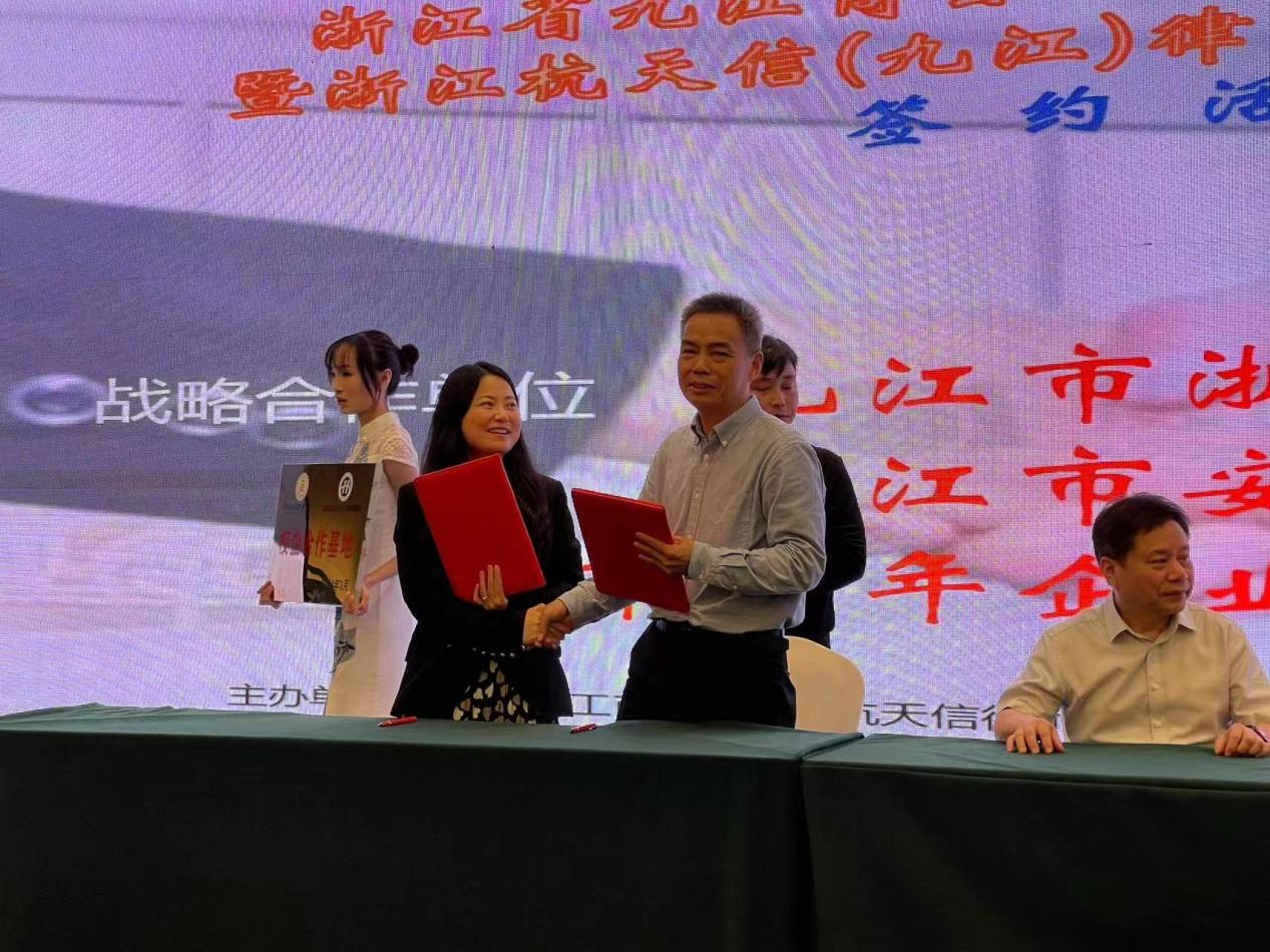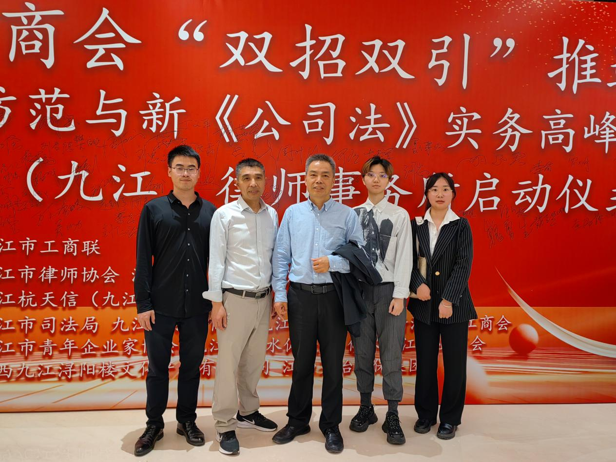 期间,文道贵院长一行还应邀出席了浙江省九江商会“双招双引”推进会暨浙江杭天信(九江)律师事务所启动仪式。在会上,文道贵院长与浙江杭天信律师事务所副主任汪红妖分别代表马克思主义学院与杭天信(九江)律所共同签署了战略合作协议,并举行了校企合作基地授牌仪式。