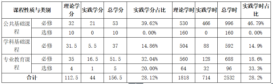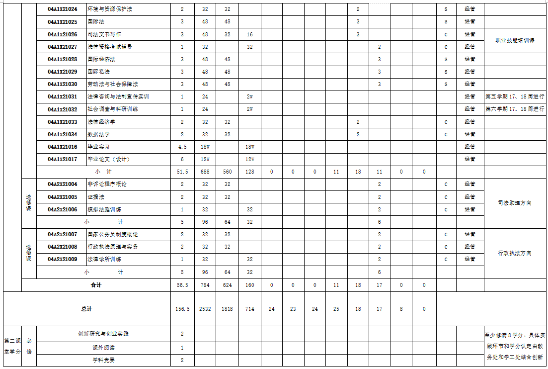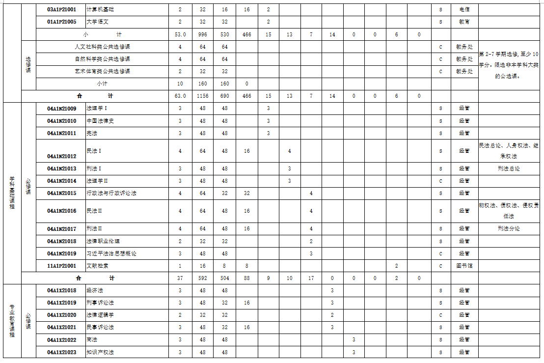 表三:法学专业人才培养方案课程设置表