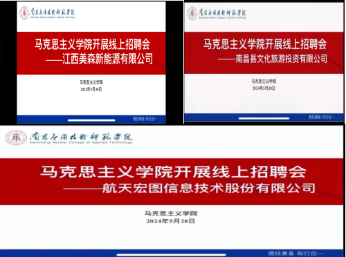 马克思主义学院于2024年5月30日召开了线上就业招聘会。本次会议邀请到了江西美森新能源有限公司、航天宏图信息技术股份有限公司、南昌县文化旅游投资有限公司相关负责人参会,学院党总支副书记李婷、毕业生辅导员、全体毕业生参加。会议由就业专员朱文清主持。