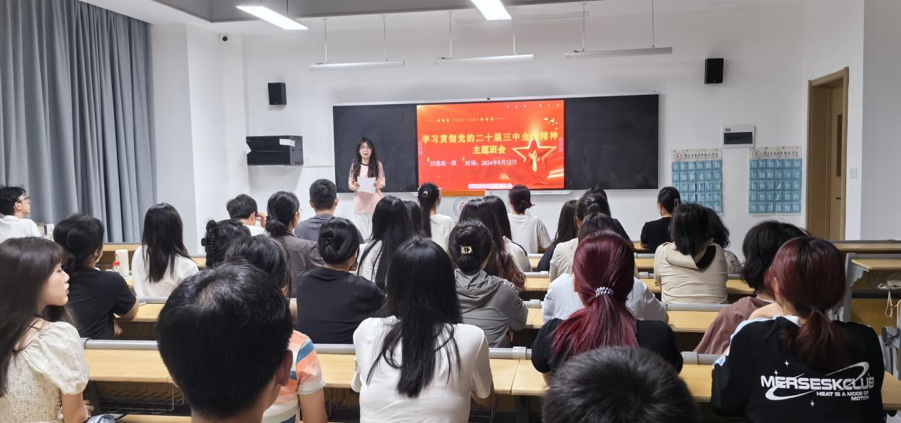 为深入学习贯彻党的二十届三中全会精神,引导青年学生坚定理想信念,增强责任感和使命感。9月12日晚上,马克思主义学院星火班23级思政1班在教学楼沁苑二教B座304成功举办了一场以“学习贯彻党的二十届三中全会精神”为主题的班会活动。本次主题班会由班长郯良星主持,全班同学参加。