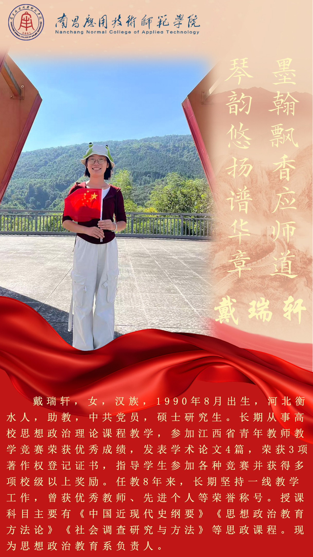先进典型 优秀毕业生 优秀在校生 优秀教职工 您现在的位置是:首页 > 先进典型 > 优秀教职工 戴瑞轩 思想政治教育系主任 管理员2025-06-09611 上一篇 龚三妹 法学系主任 下一篇 邹颖 最美辅导员