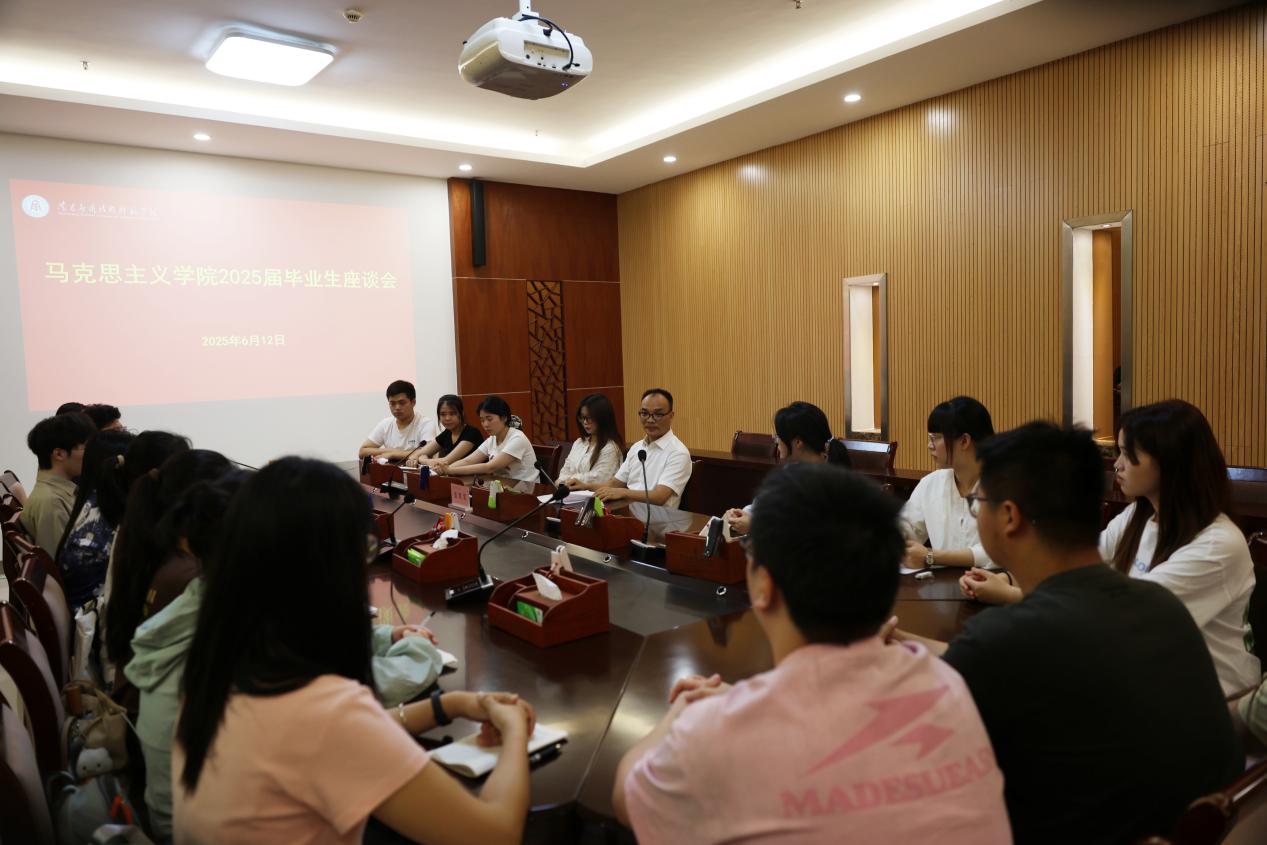 6月12日,马克思主义学院2025届毕业生座谈会在九龙湖校区第一会议室举行。校党委副书记、马克思主义学院院长蓝贤发与学院的毕业生代表亲切围坐,深入交流,共同回顾大学成长历程,畅谈未来发展理想。