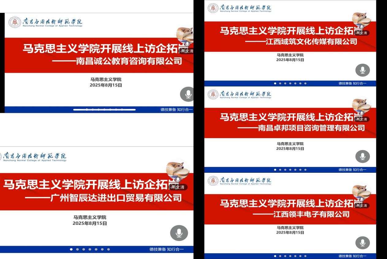 为拓宽毕业生就业渠道,强化校企合作,给学生提供更广阔的职业发展空间,8月15日,马克思主义学院党总支书记张欣康通过视频形式对南昌诚公教育咨询有限公司、广州智辰达进出口贸易有限公司、江西域筑文化传媒有限公司、南昌卓邦项目咨询管理有限公司、江西领丰电子有限公司进行访问,双方就人才培养、实习实训、就业指导等方面进行了深入交流,并达成了一系列合作意向。