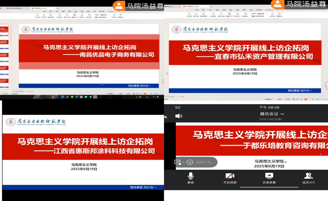 为进一步拓宽毕业生就业渠道,加强校企合作,促进学生高质量就业,马克思主义学院于2025年8月19通过视频会议的方式与南昌优品电子商务有限公司、宜春市弘禾资产管理有限公司、江西省惠斯邦涂料科技有限公司、于都乐培教育咨询有限公司开展了线上访企拓岗活动。